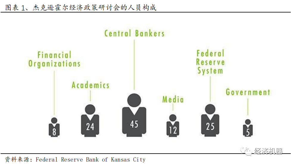 1978年開始,堪薩斯聯儲在堪薩斯召開了一系列經濟研討會,話題相當廣泛,比如起初四次是關于農業問題的,因為當時農業問題很重要。1982年起,話題開始轉向了經濟和貨幣政策,并把地點固定在了堪薩斯州的一個山谷:杰克遜·豪爾,即杰克遜·霍爾經濟政策研討會。這個會議是世界上歷史最悠久的中央銀行會議之一。研討會匯集了來自70個國家的經濟學家、金融市場參與者、學者、美國政府代表和新聞媒體,總計約120人,討論共同關心的長期政策問題(圖表1)。