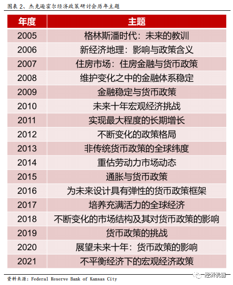 根據議程,杰克遜霍爾經濟政策研討會包括上午和下午兩個時段,其中上午時段從九點開始到十二點結束,而下午時段從一點開始到四點結束。具體來看,九點到九點半,會議舉辦方負責人堪薩斯聯儲主席George將致歡迎辭,隨后美聯儲主席Powell將通過堪薩斯城聯儲的YouTube頻道向公眾直播,全市場都在關注鮑威爾即將做出的聲明,尤其是他是否將做出Taper的表述。九點半之后則開始了學術討論,上下午學術討論的議程比較一致,都是兩個單人專題演講加一個三人小組討論。