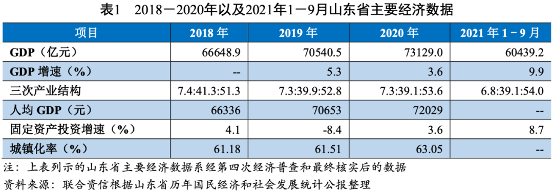 山東省經濟和財政實力強,GDP和一般預算收入規模長期排名全國前列,2021年1-9月,山東省經濟延續增長態勢。由于加大對改善民生以及經濟結構調整的支持力度,山東省政府債務余額持續增長,2020年末居全國第2位,距財政部下達的政府債務限額尚有一定的空間。山東省政府負債率在全國排名靠前,政府債務率在全國排名中游,考慮到山東省產業基礎和財政實力強,整體債務風險可控。