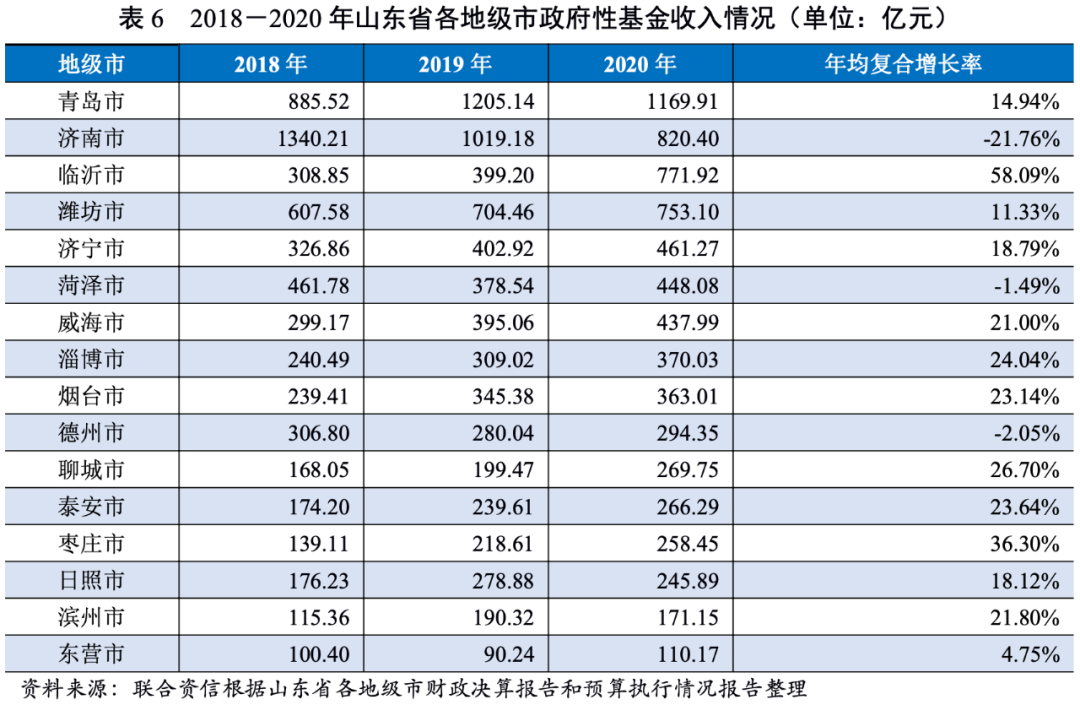 從各地級市政府財力對“發債城投企業全部債務+地方政府債務”的保障支持程度來看,2020年一般公共預算收入、政府性基金收入和地方綜合財力對“發債城投企業全部債務+地方政府債務”覆蓋程度相對較低的地級市為濰坊市、威海市、青島市、濟寧市、泰安市、濱州市和濟南市,覆蓋程度較高的為聊城市、菏澤市、棗莊市和臨沂市。