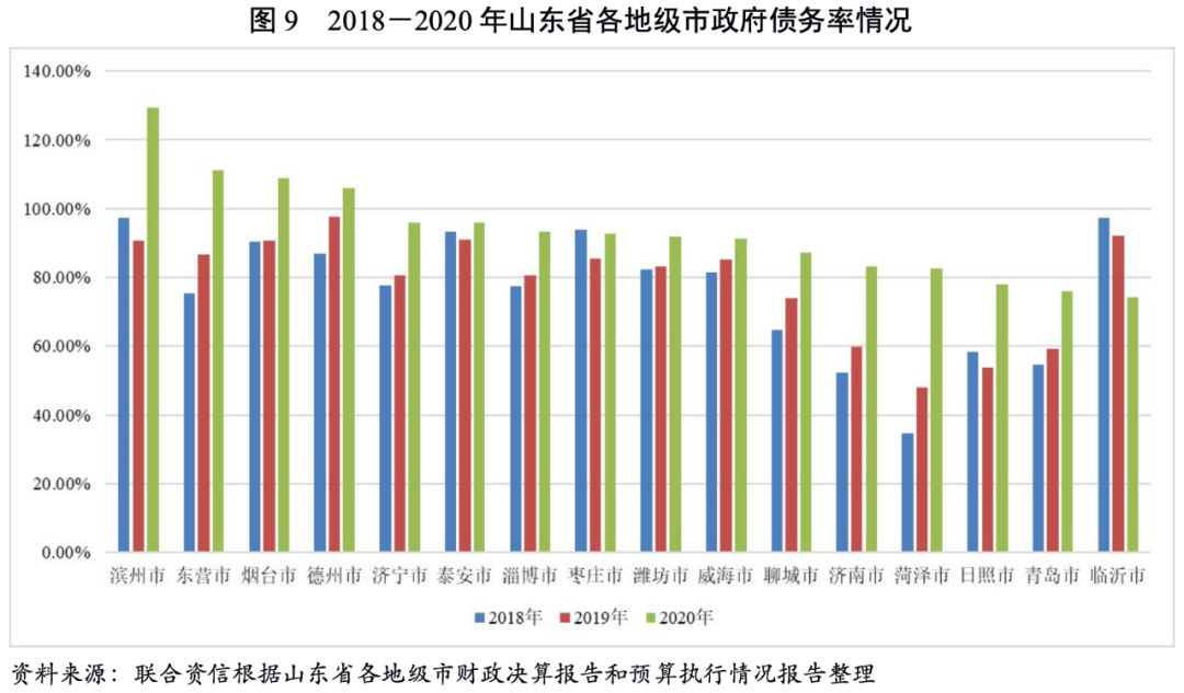 2018-2020年,除臨沂市和棗莊市外,山東省其他地級市政府債務率均呈增長態勢,菏澤市、東營市、濱州市和濟南市增速較快。2020年,濱州市政府債務率超過125%,東營市、煙臺市和德州市政府債務率均超過100%,濟寧市、泰安市、淄博市、棗莊市、濰坊市、威海市和聊城市政府債務位于85%~100%之間,其余地級市的政府債務率位于85%以下。整體看,山東省地級市政府債務償還壓力分化較為明顯,財政實力強的濟南市和青島市的政府債務償還能力強于其他地級市,相比之下,濱州市、東營市、煙臺市和德州市的政府債務償還壓力相對較大。