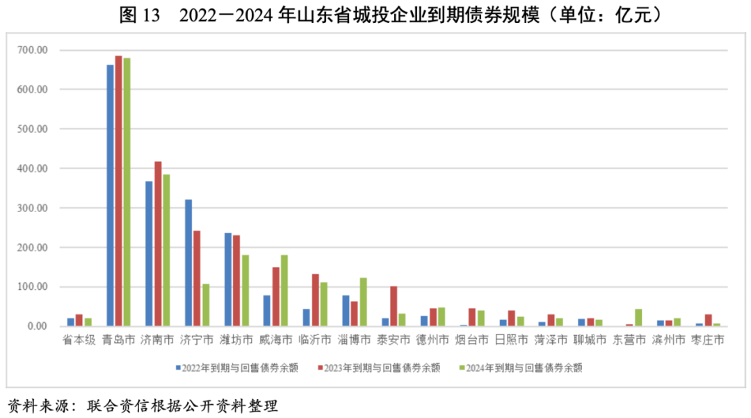 從山東省各地級市發債城投企業未來三年(2022-2024年)到期債券規模看,青島市和濟南市的城投企業未來三年集中到期債券規模大,棗莊市、濱州市和東營市城投企業到期債券規模相對較小。從山東省各地級市發債城投企業未來三年到期債券規模占已發行債券規模的比重看,大部分地級市占比在70%~90%之間,泰安市未來三年到期債券規模占比最大(占91.12%),濱州市占比最小(占61.99%)。