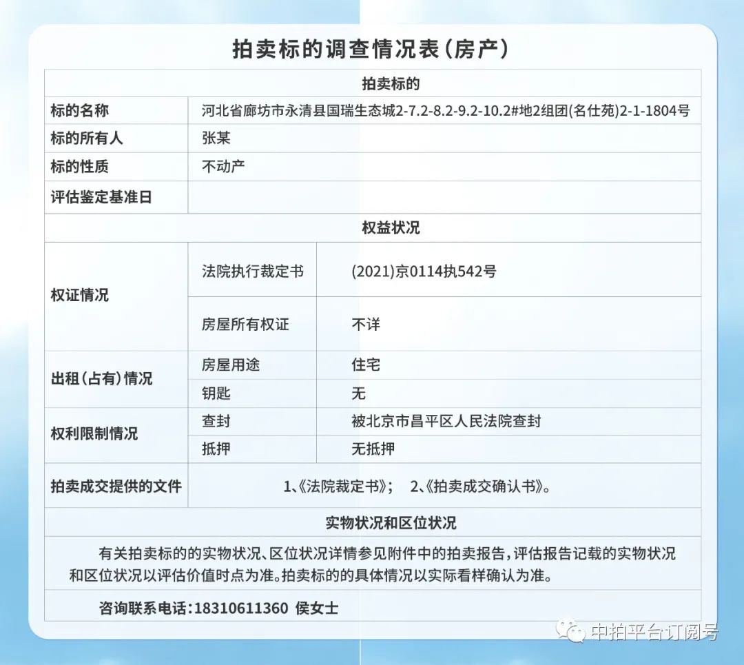 息,供大家參考。凡具備完全民事行為能力的公民、法人和其他組織均可參加競(jìng)買。有意購買者可聯(lián)系侯女士咨詢,聯(lián)系電話18310611360。