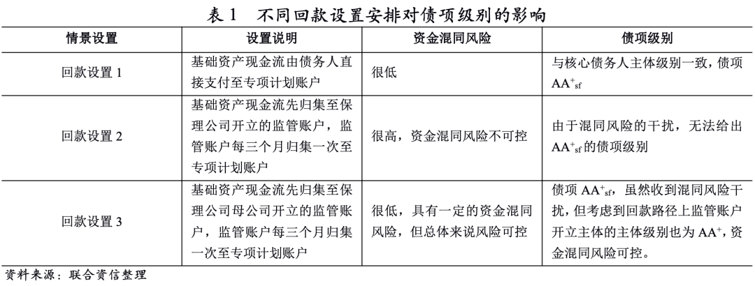 結(jié)構(gòu)化產(chǎn)品另外一個交易結(jié)構(gòu)的關(guān)注點就是基礎(chǔ)資產(chǎn)現(xiàn)金流的回款路徑和劃款頻率。眾所周知,國內(nèi)資產(chǎn)證券化產(chǎn)品由于在法律等方面很難做到完全的破產(chǎn)隔離,基礎(chǔ)資產(chǎn)現(xiàn)金流和資產(chǎn)服務(wù)機(jī)構(gòu)的其他現(xiàn)金流容易出現(xiàn)資產(chǎn)混同。現(xiàn)有緩釋這類風(fēng)險的主要方式就是控制回款路徑和劃款頻率。也就是說,回款現(xiàn)金流從產(chǎn)生至歸集到專項計劃賬戶的路徑和頻率是結(jié)構(gòu)化產(chǎn)品需要重點把控的環(huán)節(jié)。單一債務(wù)人供應(yīng)鏈產(chǎn)品也是如此。目前市場上存續(xù)的單一債務(wù)人供應(yīng)鏈產(chǎn)品基本上都能實現(xiàn)回款現(xiàn)金流閉環(huán),即基礎(chǔ)資產(chǎn)現(xiàn)金流一旦產(chǎn)生,直接回流至專項計劃賬戶,這種情況下資金混同風(fēng)險很低。但是評級根據(jù)多年的實踐,在大量的產(chǎn)品結(jié)構(gòu)設(shè)計中,發(fā)現(xiàn)產(chǎn)品回款設(shè)置存在多樣性,不同的回款設(shè)置帶來高低不一的混同風(fēng)險。所以即使底層基礎(chǔ)資產(chǎn)償付主體的償付能力和償付安排都相同,但也會可能由于基礎(chǔ)資產(chǎn)回款結(jié)構(gòu)設(shè)置的不同而導(dǎo)致最終產(chǎn)品面臨不同的償付風(fēng)險,最終影響債項的級別。