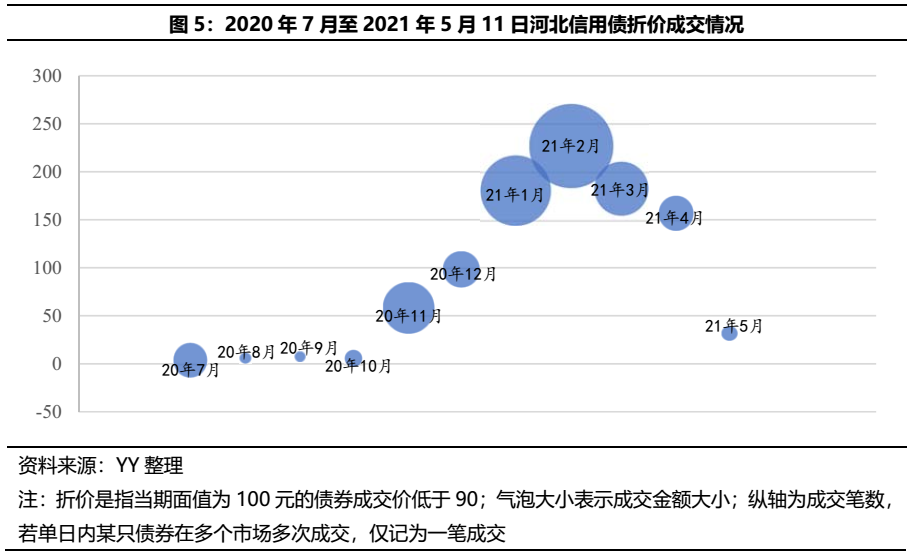 2020年7月起,河北省債券開始出現折價成交,除少量對東旭系債的折價處理外,其余主要為冀中能源債,導火索是7月15日河北省國資委對省內四家國企下達的向冀中能源提供發債擔保通知,內在則是機構對冀中能源沉重債務的隱憂開始由交易面顯現;至2020年11月永煤違約后,市場情緒再度引燃,折價成交規模被直線拉高;隨后,在市場圍繞冀中能源博弈的同時,陷入對賭失敗、流動性壓力、實控權變更傳聞以及境外債大跌的華夏幸福又搶奪了市場焦點,市場在2021年1月便形成了對其違約的一致預期,機構紛紛低價拋售;2月,華夏幸福實質性違約。而冀中能源依舊一期期硬扛著,河北債市圍繞這兩大債務主體進入到相對漫長的折價處理周期。