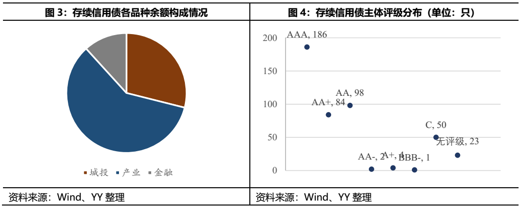 截至目前,河北省存續信用債余額4,134.6億元(剔除同業存單)。從品種來看,產業債>城投債>金融債;主體評級多集中在AAA(省內大型國企居多),主體評級為C的存續債50只全部為已實質違約的華夏幸福系和東旭系所發。