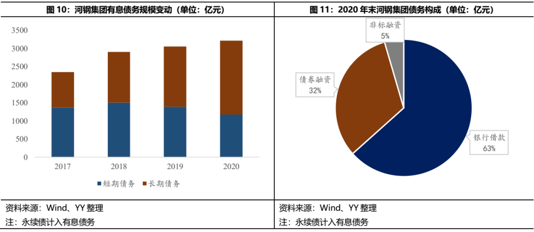 對于過剩行業內的傳統大型國企而言,債務沉重是通病,河鋼也不例外。截至2020年末,河鋼集團有息債務總規模達3,216.6億元,逐年走高;好的方面是債務期限結構有好轉態勢,20年末短期債務占比降至36.7%。融資結構來看,銀行借款在全部債務中比重超6成,同時非標融資占比較小,整體融資結構較為健康。