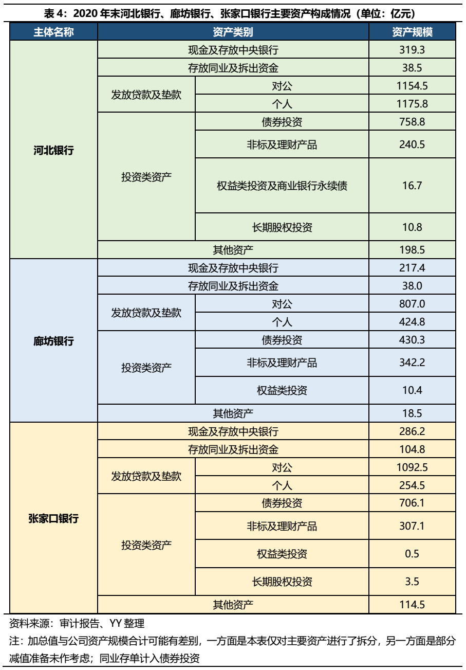 資產構成視角來看,省內存續余額最多的三家銀行河北銀行、廊坊銀行、張家口銀行均是貸款及投資并重的資產結構,并且都存在一定規模的非標投資亟待壓降。