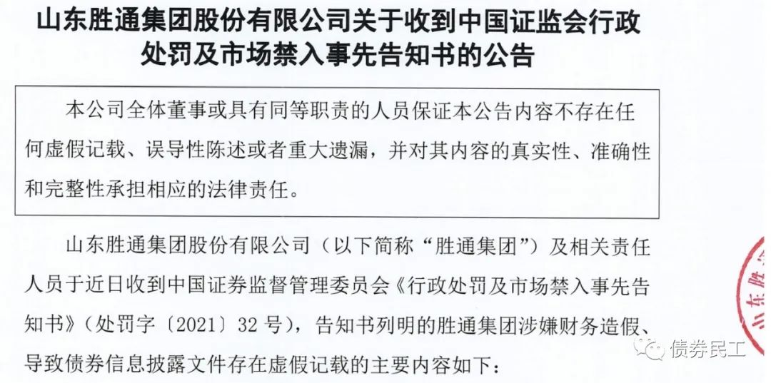 根據山東勝通集團股份有限公司(以下簡稱“山東勝通集團”)于2021年5月14日披露的公告文件,中國證監會已經對公司下發行政處罰和市場禁入事先告知書,主要原因是公司“涉嫌財務造假、導致債券信息披露文件存在虛假記載”。