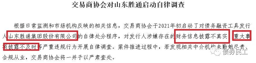 在此之前的2021年4月7日,交易商協會已經對山東勝通集團對啟動自律調查,主要原因是“財務信息披露不真實、重大事項披露不及時”。其中最關鍵的是財務信息披露不真實,可能會涉嫌財務造假等問題。