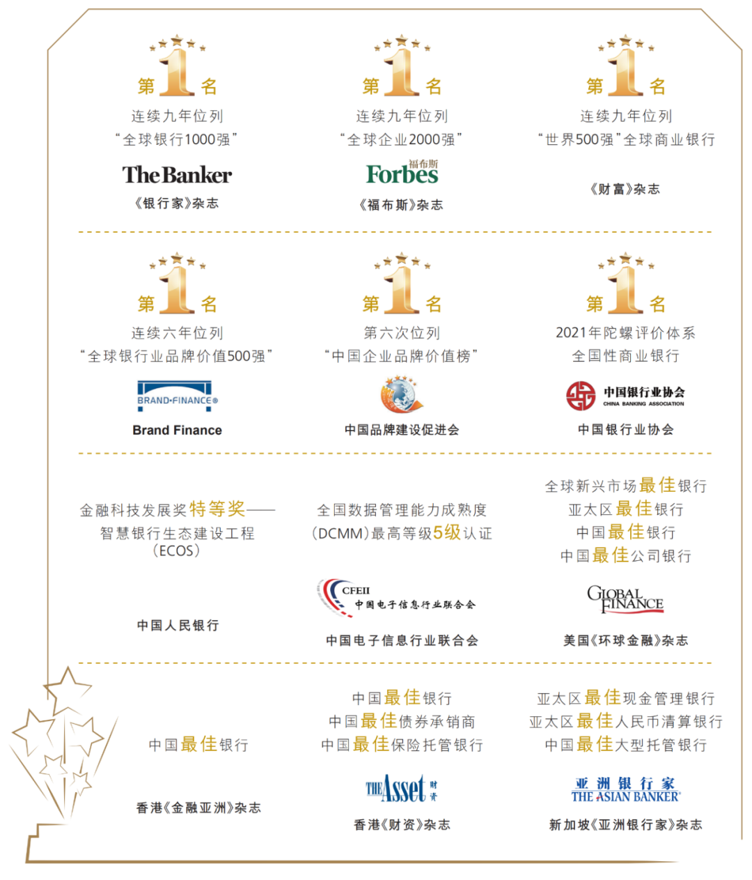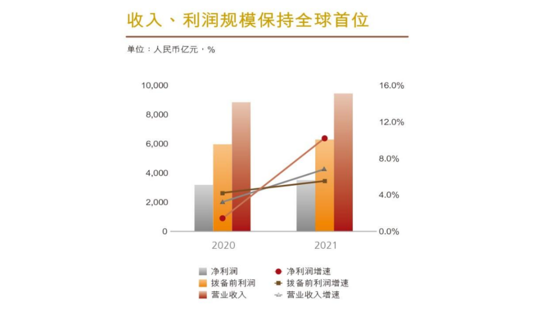 根據工行2021年報,不管資產、資本、存款、貸款,該行繼續保持全球第一,凈利潤繼續保持全球銀行業第一地位。從國際排名來看,工行已經連續9年位列英國《銀行家》全球銀行1000強和美國《福布斯》全球企業2000強榜首、位列美國《財富》500強榜單全球商業銀行首位,連續6年蟬聯全球最具價值銀行品牌榜首。