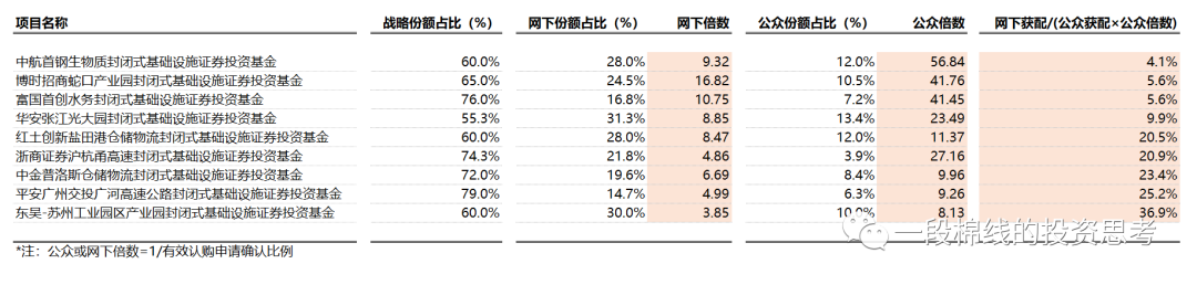 如果上市后REITs的二級市場價格出現了“爆炒”現象,并認為券商自營盤、銀行理財資金等均會通過拋售起到“壓秤”的作用,可以通過觀察網下獲配金額和網上參與配售金額(網上獲配金額×網上倍數)的比例衡量壓制價格暴漲的“秤砣”份量。從下表可以看出,其中“最重的秤砣”為36.9%,而“最輕的秤砣”僅為4.1%,券商壓制“爆炒”傾向時做市的難度不低!