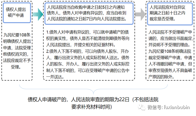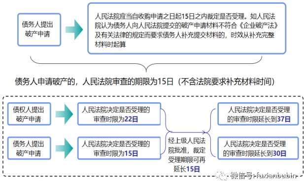 另外如遇到特殊情況,經上級人民法院批準,人民法院裁定受理的期限可延長到15日,即如果是債權人申請破產,人民法院審查的最長期限為37日,如是債務人,負有清算責任人的申請批次,人民發運審查的最長期限為30日。