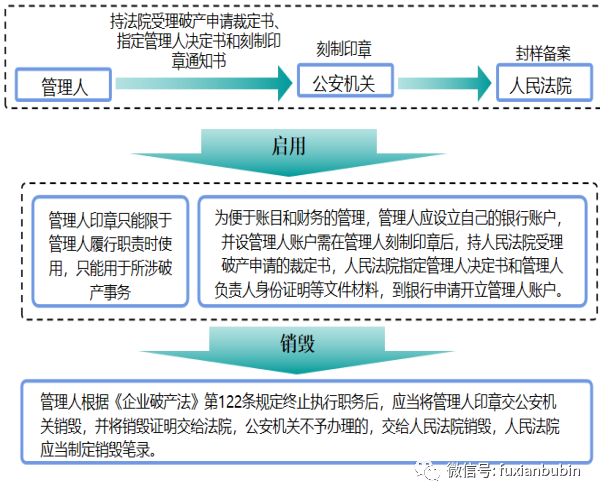 刻制印章(持法院受理破產申請裁定書、制定管理人決定書和刻制印章通知書到公安機關刻制,并到法院封樣備案,終止執行職務時應交公安機關銷毀),開設管理人賬戶(在管理人刻制印章后,持人民法院受理破產申請的裁定書,人民法院指定管理人決定書和管理人負責人身份證明等文件材料,到銀行申請開立管理人賬戶);管理人根據《企業破產法》第122條規定終止執行職務后,應當將管理人印章交公安機關銷毀,并將銷毀證明交給法院,公安機關不予辦理的,交給人民法院銷毀,人民法院應當制定銷毀筆錄。