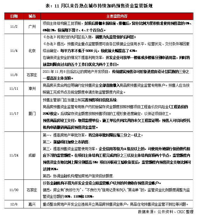 此外,雖然居民按揭端邊際放松,但后續傳導至房企資金端仍面臨阻力。二季度以來民營房企信用風險加速暴露,出于“保民生、保交樓、保穩定”的考慮,11月北京、成都、石家莊、廈門、漳州和廣州等城陸續發布升級版預售資金監管規定。從各地預售資金監管政策的變化來看,主要從“提高資金監管的監管額度”、“調整入賬管理模式,先監管后網簽”以及“加強分類監管”等手段來保障預售資金的安全。
