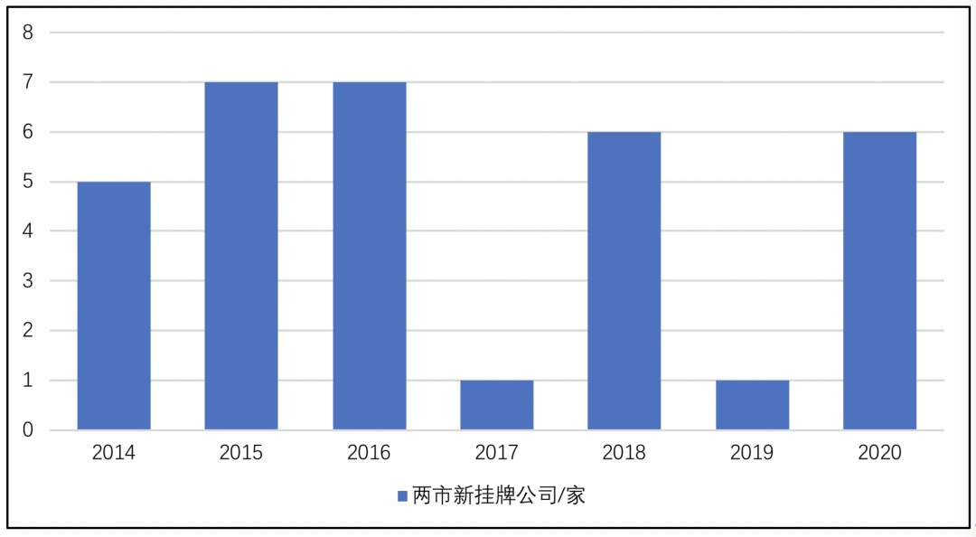 圖2 2014-2020年上交所、深交所優先股市場新增上市公司數量