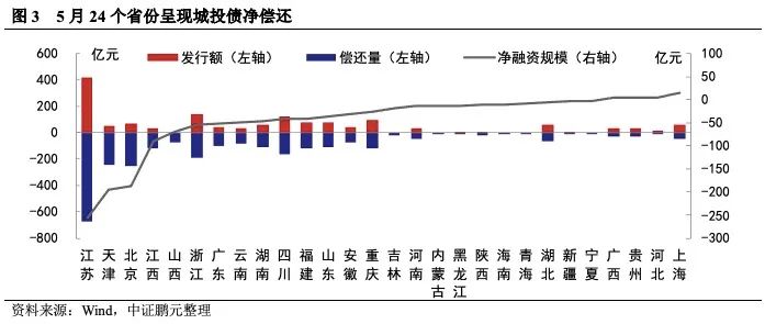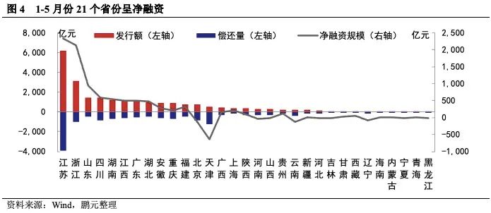 24個(gè)省份城投呈現(xiàn)凈償還,以江蘇、天津、北京的凈償還規(guī)模較大。5月份,城投債發(fā)行規(guī)模較為集中的省份與前期變化不大,江蘇、浙江、四川等省份繼續(xù)領(lǐng)跑全國。發(fā)行規(guī)模驟減導(dǎo)致5月份共有24個(gè)省份呈城投債凈償,江蘇、浙江和北京分別以凈償還255.65億元、194.50億元、187億元位于前三位;5月份,實(shí)現(xiàn)凈融資的省份僅4個(gè),且凈融資規(guī)模均較小。