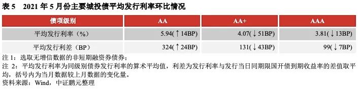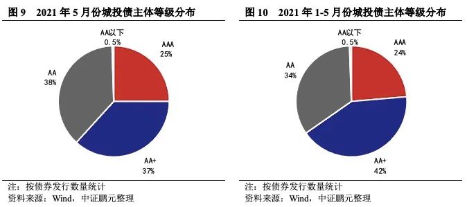 5月份高級別主體發(fā)債占比近6成,主體評級中樞下移。5月份,發(fā)行主體在AA+級及以上的城投債占比合計(jì)為61.8%,較上月減少1.5個(gè)百分點(diǎn),主體信用級別中樞下移。綜合1-5月份情況來看,發(fā)行主體在AA+級(含)以上等級的城投債合計(jì)占比65%,較1-4月份中樞下移,但與2020年主體級別中樞基本持平。