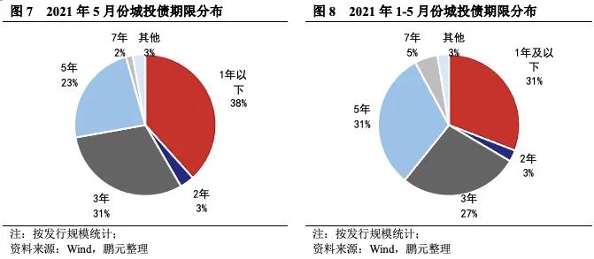 5月份城投債平均發(fā)行期限為2.78年,較4月份的3.64年縮短24%。發(fā)行期限縮短說明債券市場偏謹(jǐn)慎,風(fēng)險(xiǎn)偏好減弱。就發(fā)行數(shù)量來看,5月份發(fā)行的城投債中,3年期城投債發(fā)行67只,占比32%,發(fā)行規(guī)模462.04億元,占比31%;5年期城投債發(fā)行44只,占比21%,發(fā)行規(guī)模354.20億元,占比23%;一年以內(nèi)短期限期品種發(fā)行81只,發(fā)行規(guī)模580.20億元,占比分別為39%、38%。綜合1-5月情況來看,3年期、5年期和一年以內(nèi)城投債發(fā)行數(shù)量占比分別為29%、28%、33%,發(fā)行規(guī)模占比分別為27%、31%、31%。
