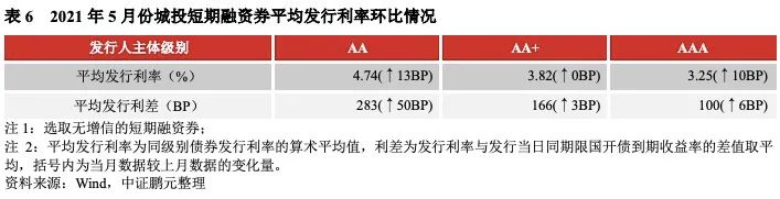 2021年5月份,無增信城投債的最高發(fā)行利率為7.50%,較上月下行50BP;最低發(fā)行利率為2.29%,較上月下行11BP,利率區(qū)間收窄。分級別來看,無增信AA級、AA+級、AAA級城投債的平均發(fā)行利率較4月份分別上行14BP,下行51BP、下行13BP,發(fā)行利差分別擴(kuò)大24BP、收窄43BP、收窄7BP。城投短期融資券品種(含超短融)的發(fā)行利率全線上行,利差呈現(xiàn)擴(kuò)大趨勢。