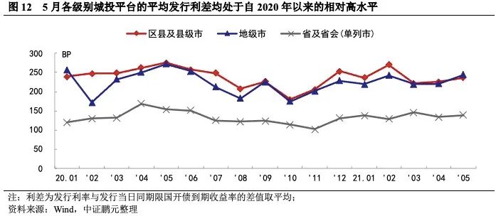從各級別城投平臺平均發(fā)行利差來看,5月份各行政級別平臺發(fā)行利差環(huán)比均走闊。區(qū)縣及縣級市平臺、地級市平臺、省及省會(huì)(單列市)平臺的發(fā)行利差分別較上月擴(kuò)大11BP、23BP、4BP。同時(shí),可以觀測到各級別城投平臺的平均發(fā)行利差均處于自2020年以來的相對高水平,表現(xiàn)出市場對當(dāng)前新發(fā)城投債偏謹(jǐn)慎,城投發(fā)行成本上升。