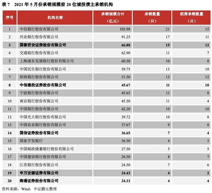 2021年5月,共有73家機(jī)構(gòu)參與了城投債的承銷工作,發(fā)行下降致城投承銷商較上月減少28家。總體來看,銀行類機(jī)構(gòu)的總體排名較為領(lǐng)先。就承銷規(guī)模而言,中信銀行以103.98億元的承銷規(guī)模位居第一,連續(xù)5個(gè)月蟬聯(lián)榜首;興業(yè)銀行以91.25億元的承銷規(guī)模位居第二。承銷規(guī)模前二十位的機(jī)構(gòu)中,券商類機(jī)構(gòu)共有5家,較4月份減少1家。除國泰君安排名券商第一位,總排名第三位以外,中信建投、國信證券、申萬宏源和海通證券分別位列第8、14、19、20位。