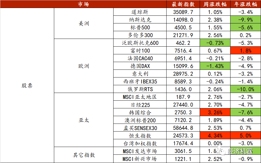 春節假期,外圍股市整體表現良好,漲多跌少。美股中,納斯達克指數周漲幅最大,為2.38%。亞太股市整體較為強勢,其中恒生指數漲幅周漲幅最大,達4.34%。從年初累計收益看,大部分市場指數收益率仍是負值,但恒生指數達5%。恒生科技股、線下消費股節日期間漲幅較大。