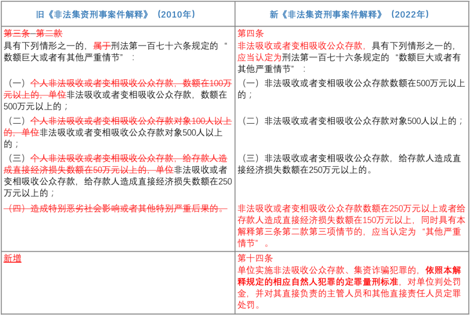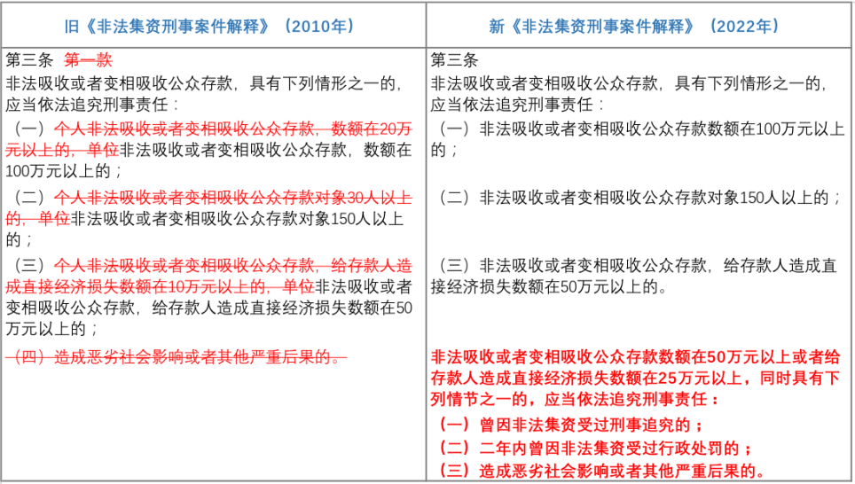 其中需要特別強(qiáng)調(diào)的在于,就非法吸收公眾存款罪的“立案標(biāo)準(zhǔn)”而言,新《非法集資刑事案件解釋》站在注重特殊預(yù)防的角度,針對行為人的再犯危險性進(jìn)行評價。故而在非吸數(shù)額或者非吸造成損失數(shù)額僅達(dá)入罪標(biāo)準(zhǔn)的一半的情況下,若行為人曾因非法集資受過刑事處罰或者2年內(nèi)因非法集資受過行政處罰的,也會被認(rèn)定構(gòu)成犯罪。