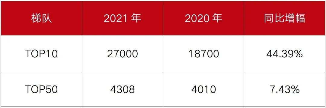 與2020年相比,TOP10門檻提升8300萬方,增幅為44.39%;TOP50門檻提升298萬方,增幅達(dá)7.43%。較2020年,TOP10的門檻增幅最大,頭部企業(yè)的提升度進(jìn)一步加速。