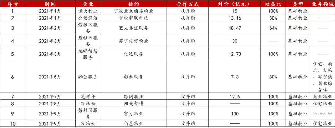 年內(nèi),碧桂園服務(wù)、萬物云、世茂服務(wù)、金科服務(wù)等多家企業(yè)不斷出手優(yōu)質(zhì)標(biāo)的,高交易額、高頻次;并刷新業(yè)內(nèi)最貴收購(gòu)單價(jià)記錄(碧桂園服務(wù)更是斥資百億收購(gòu)富力物業(yè));亦出現(xiàn)“小吃大”的經(jīng)典案例,合景悠活拿出1/3募資額收購(gòu)斥資13.6億收購(gòu)雪松智聯(lián)。