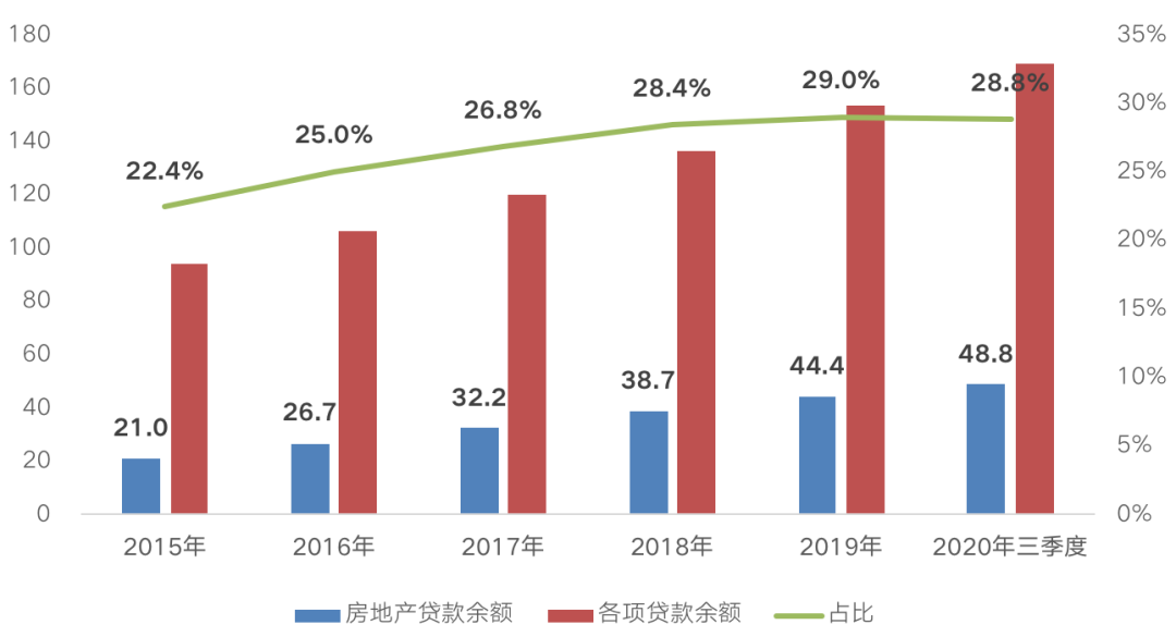 截至2020年三季度,全國(guó)房地產(chǎn)貸款余額高達(dá)48.8萬億元,較2015年凈增長(zhǎng)132%,占各項(xiàng)貸款余額的比重多達(dá)28.8%,較2015年提升6.4個(gè)百分點(diǎn)。說明在實(shí)體經(jīng)濟(jì)投資回報(bào)率低、風(fēng)險(xiǎn)高企的大環(huán)境下,房地產(chǎn)行業(yè)“吸金”效應(yīng)依舊不減。