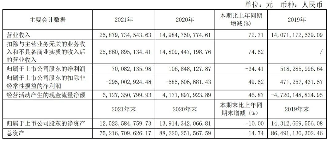 接下來光明地產的營收增速更猛。如下圖年報數(shù)據(jù)顯示,2021年營收258.8億元,同比增長72.71%。但歸母凈利潤有點慘,同比下跌了34.41%為7008.2萬元。扣非后的凈利潤為負值,2.95億元,不過比2020年同期的-5.86億元縮窄了一些。