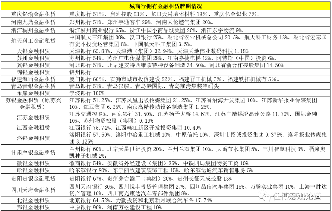 目前共有22家城商行擁有金融租賃牌照,分別為北京銀行、江蘇銀行、寧波銀行、南京銀行、徽商銀行、錦州銀行、哈爾濱銀行、中原銀行、貴陽銀行、天津銀行、蘇州銀行、青島銀行、河北銀行、鄭州銀行、重慶銀行、浙江稠州商業銀行、漢口銀行、廈門銀行、江西銀行、洛陽銀行、蘭州銀行、天府銀行。