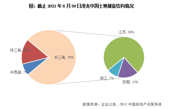 近八成土儲(chǔ)位于長(zhǎng)三角,重倉(cāng)江蘇省。截止2021年6月30日,港龍中國(guó)在全國(guó)共擁土地儲(chǔ)備總建筑面積為1075.7萬(wàn)平方米。從分布來(lái)看,長(zhǎng)三角土儲(chǔ)建面占比達(dá)78%,市場(chǎng)地位持續(xù)鞏固,但也存在土儲(chǔ)集中分布的風(fēng)險(xiǎn)。從省份來(lái)看,長(zhǎng)三角的江蘇省總土儲(chǔ)建面占比相比2020年上升4個(gè)百分點(diǎn),達(dá)58%,從新增土儲(chǔ)分布來(lái)看,未來(lái)比例或會(huì)進(jìn)一步上升。此外,安徽省與年初持平,而浙江省占比下降4個(gè)百分點(diǎn)至7%。珠三角土儲(chǔ)主要分布在廣東省,占比達(dá)15%。中西部的河南、貴州和四川土儲(chǔ)建面占比共計(jì)7%。
