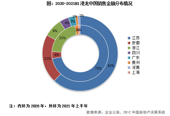 長(zhǎng)三角銷(xiāo)售額占比91%,安徽省銷(xiāo)售強(qiáng)勁。從銷(xiāo)售金額的分布來(lái)看,長(zhǎng)三角作為大本營(yíng),占比高達(dá)91%。江蘇作為發(fā)家地,銷(xiāo)售金額占比雖相比2020年下降了10個(gè)百分點(diǎn),仍達(dá)62%。根據(jù)CRIC監(jiān)測(cè)的江蘇12個(gè)城市榜單來(lái)看,企業(yè)只在常熟、常州和宜興3個(gè)城市上榜,港龍?jiān)谖磥?lái)還需加大本土市場(chǎng)的深耕,省內(nèi)業(yè)績(jī)還有提升空間。安徽作為2020年新進(jìn)省份,銷(xiāo)售強(qiáng)勁,地位替代浙江,銷(xiāo)售額占比相比2020年提升17個(gè)百分點(diǎn)至21%,位列第二。其余省份銷(xiāo)售額占比均小于10%,其中廣東和四川同為2020年新進(jìn)省份,開(kāi)始貢獻(xiàn)銷(xiāo)售額,占比分別為4%和3%。