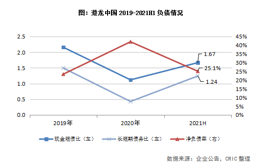 凈負(fù)債率和剔除預(yù)收款的資產(chǎn)負(fù)債率相比期初下降,成功跨入綠檔。截止至2021年6月30日,港龍中國(guó)的凈負(fù)債率為25.1%,相比于2020年的42%,下降了16.9個(gè)百分點(diǎn),回到2019年水平,遠(yuǎn)低于行業(yè)平均。剔除預(yù)收款的資產(chǎn)負(fù)債率達(dá)67.7%,較期初下降14.5個(gè)百分點(diǎn),低于三道紅線(xiàn)70%的閾值,成功跨入綠檔。