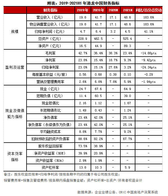 2020年大幅擴(kuò)張,2021年上半年趨于謹(jǐn)慎。2020年全口徑拿地銷(xiāo)售金額比0.68,初期擴(kuò)張力度大,至2021年上半年,拿地銷(xiāo)售金額比降至0.24,低于百?gòu)?qiáng)房企的0.29,可見(jiàn)港龍的投資策略趨于謹(jǐn)慎。且根據(jù)中期業(yè)績(jī)發(fā)布會(huì),上半年意向跟蹤地塊共1259宗,經(jīng)過(guò)初判、研究、參拍等環(huán)節(jié)最終篩選出7宗地塊,可見(jiàn)企業(yè)購(gòu)地策略的謹(jǐn)慎態(tài)度。