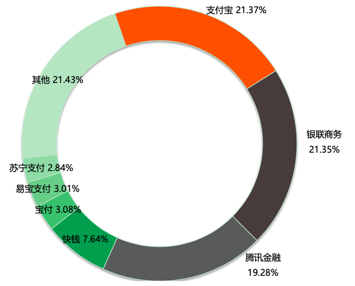 據(jù)易觀披露的最新數(shù)據(jù)顯示,截至2020年3季度末,從市場(chǎng)份額來看,我國(guó)第三方互聯(lián)網(wǎng)支付行業(yè)的前3名分別是——支付寶占比為21.37%,銀聯(lián)支付占比為21.35%,騰訊金融占比為19.28%。可以看出,支付寶、微信兩大巨頭在互聯(lián)網(wǎng)支付合計(jì)占比近五成。