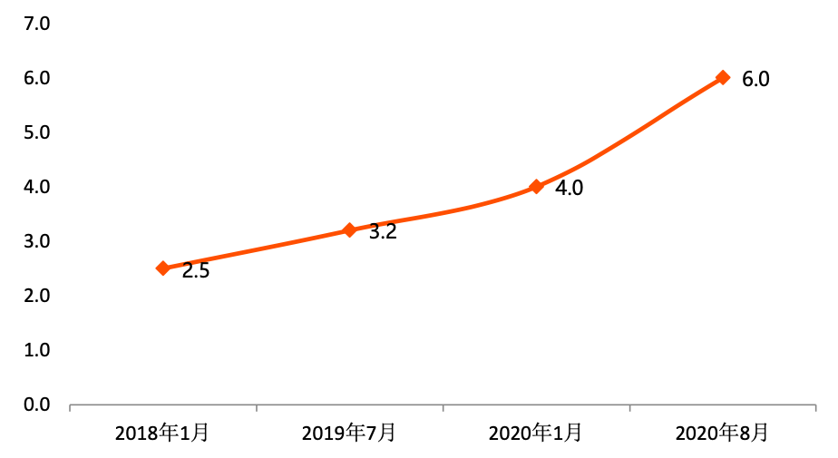 近三年,抖音日活躍用戶數(shù)量不斷加速上升。從2018年1月的2.5億人,提升到2020年8月日活躍用戶量6億人,標(biāo)志其成為高流量的互聯(lián)網(wǎng)頭部平臺(tái)之一,自身的品牌影響力更大。