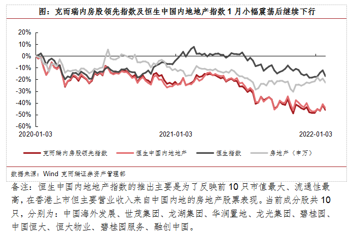 2022年1月,恒生指數(shù)上升1.7%,克而瑞內(nèi)房股領(lǐng)先指數(shù)上升6.9%,恒生中國內(nèi)地地產(chǎn)指數(shù)上升6.7%,房地產(chǎn)(申萬)板塊下降1.3%。