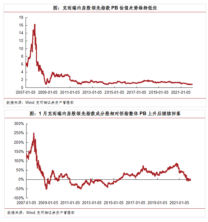 1月克而瑞領(lǐng)先股指上升6.9%,估值維持低位,成分股表現(xiàn)較好。