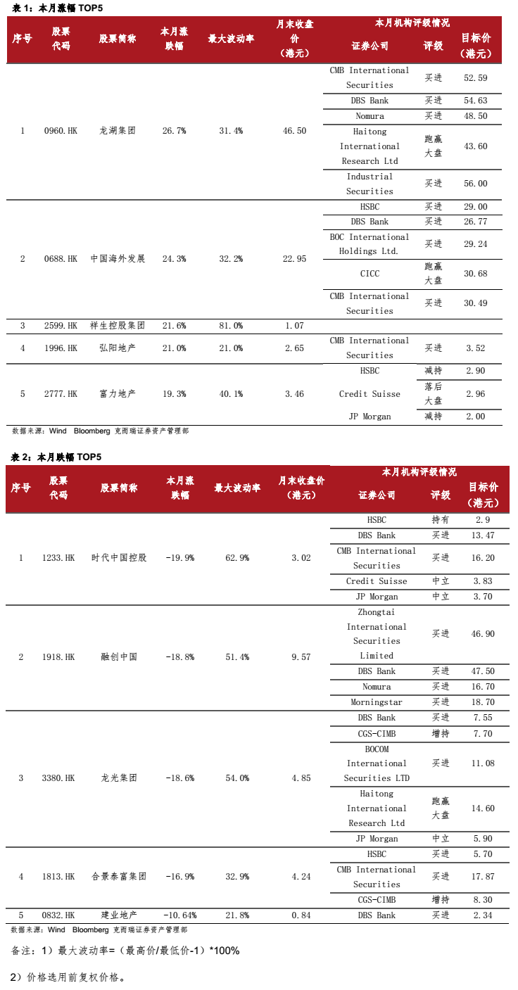 1月,成分股表現(xiàn)較好。龍湖集團(tuán)、中國海外發(fā)展、祥生控股集團(tuán)漲幅居前;而時(shí)代中國控股、融創(chuàng)中國、龍光集團(tuán)則跌幅居前。