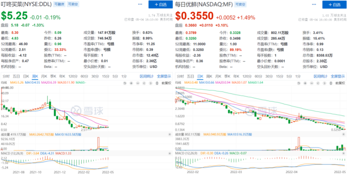 根據鋅財經統計,目前每日優鮮距上市創下11美元每股的最高點已跌至0.355美元每股,跌幅高達96.8%;叮咚買菜距最高點46美元每股已跌至5.25美元每股,跌幅高達88.6%。