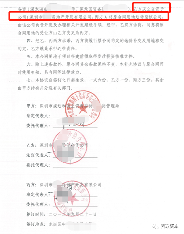 第一,補(bǔ)充協(xié)議簽訂主體為:國(guó)土部門VS股份合作公司 VS 股份合作公司新設(shè)立的全資子公司 ;