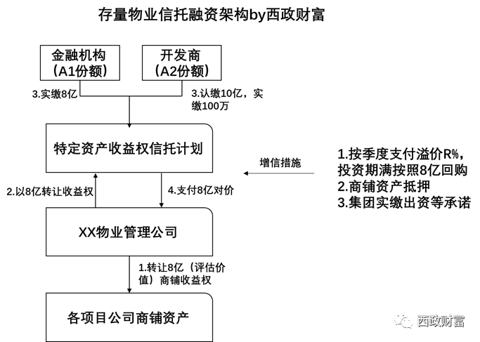“資產收益權信托計劃”一直是信托機構發行的最為典型的產品,“特定資產收益權轉讓+回購”則是該類產品的常見“打開”方式。同時,為了確保交易標的真實性,并保證交易有效性,收益權所對應的基礎資產一般需作為擔保物抵押或質押給信托公司。通過“資產收益權”方式將信托資金在使用在形式上包裝成一個投資或交易行為似乎既可以實現開發商在“三道紅線”監管規定下融資出表的目的,又能解決信托機構融資性信托額度不夠的問題。在實操層面,有的信托機構在操作時不一定要求底層資產滿足432條件,但有的卻對底層資產滿足432條件有嚴格的準入要求。同樣,有的銀保監認為在“特定資產收益權轉讓+回購”的模式下,涉及到回購即認定該類信托產品屬于融資類信托產品。以存量物業特定資產收益權信托融資為例,其產品基本架構如下: