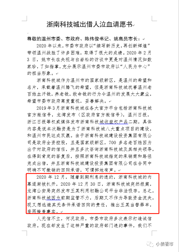 2021年的第一天,一封《浙南科技城出借人泣血請愿書》在網絡流傳,請愿書中寫道“浙南科技城因為前期監管不力,后期不作為導致資金流失,現又想逃避其無條件承諾回購的責任,推出王某當替罪羊,妄圖掩蓋事實?!?/p>