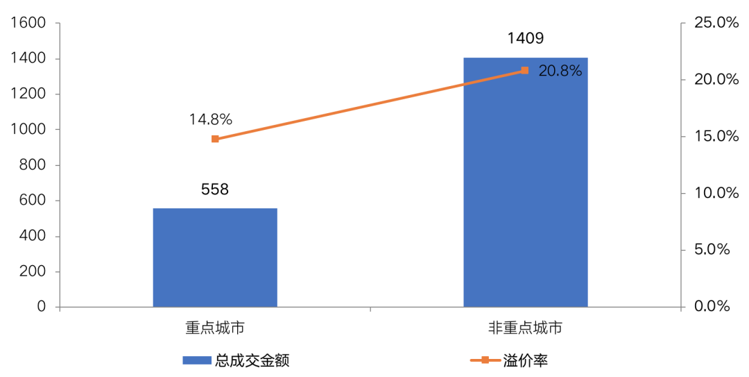 從成交情況來看,在“集中供地”新政出臺后,受重點城市暫緩土地供應影響,非重點城市成交占比顯著提升,升至72%,較新政出臺前提升了約20個百分點,不僅如此,溢價率也出現了大幅增長,升至20.8%。