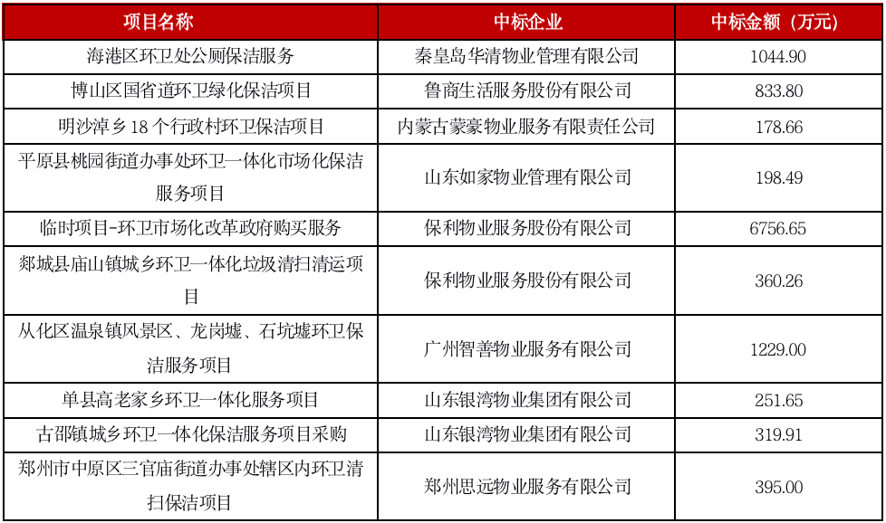 2021年部分物企獨立中標環(huán)衛(wèi)項目情況