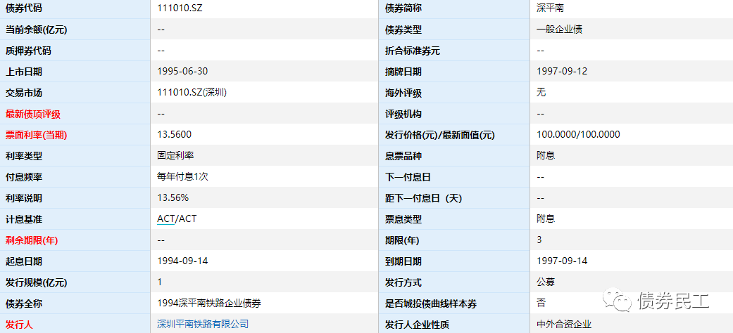 在數據整理的時候,債券民工發現了一只特別的債券“深平南”,發行人是深圳平南鐵路有限公司,發行時間為1994年,發行規模為1億元,債券類型屬于一般企業債,債券募集資金用于建設和經營管理的平南鐵路。