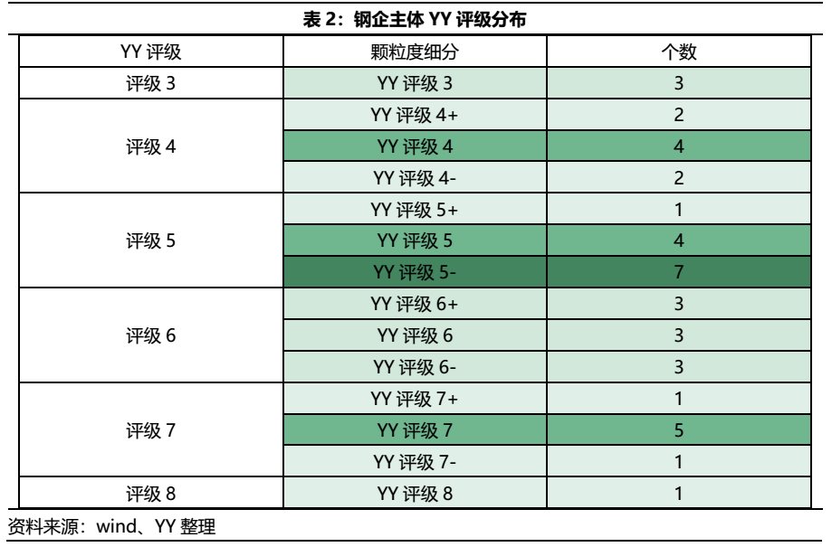 截至目前根據(jù)YY評(píng)級(jí)行業(yè)分類,鋼鐵行業(yè)存續(xù)債主體共計(jì)40個(gè)(已剔除只發(fā)可轉(zhuǎn)債的主體)。按投資級(jí)、投機(jī)級(jí)區(qū)分,有近57.5%的鋼企仍位于投資級(jí)別(產(chǎn)業(yè)YY評(píng)級(jí)1-5)。按發(fā)債主體資質(zhì)來(lái)看,結(jié)合 YY評(píng)級(jí)分布,鋼企主體較多分布在YY評(píng)級(jí)5、6和7,占比達(dá)70%;細(xì)分來(lái)看,在YY評(píng)級(jí)5中主要集中在5-,在YY評(píng)級(jí)7中主要集中在評(píng)級(jí)7本身。